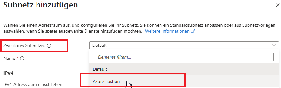 Um Azure Bastion einzurichten und somit einen sicheren Zugriff auf die in Azure bereitgestellten VMs zu ermögliche, ist es im ersten Schritt wichtig (und auch eine Voraussetzung), dass ein Subnetz mit dem Namen AzureBastionSubnet angelegt wird.